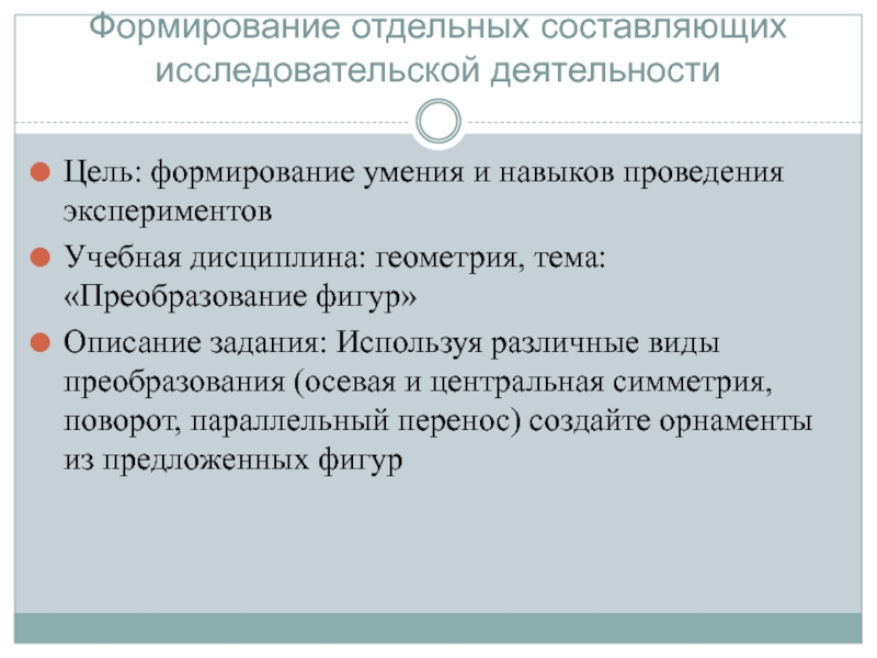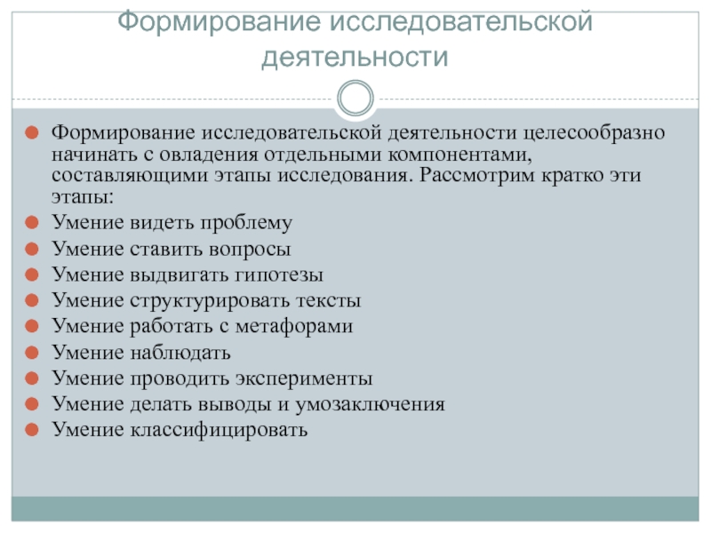 Формирование исследовательской деятельности целесообразно начинать с овладения отдельными