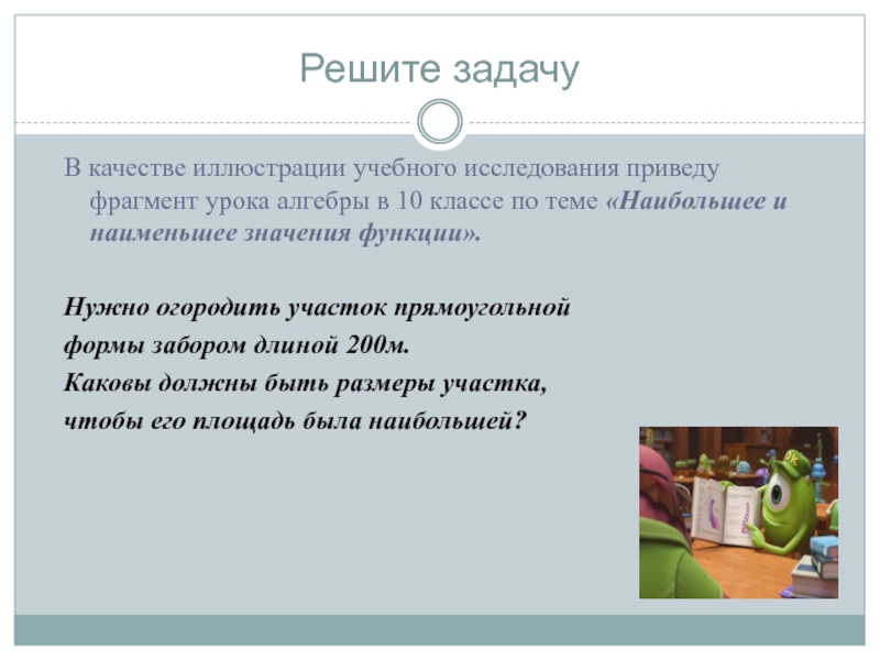 выделим оптимизируемую величину: в нашей задаче это площадь участка. Обозначим её S. Площадь зависит от измерений прямоугольника, объявим независимой переменной длину прямоугольникаи обозначим её х, ясно, что х>0. Так Р=200м, 0<х<100. Тогда ширина участка (100-х)м. Исходя из условия задачи выразим S через х. S(x)= x(100-x), xє(0;100).