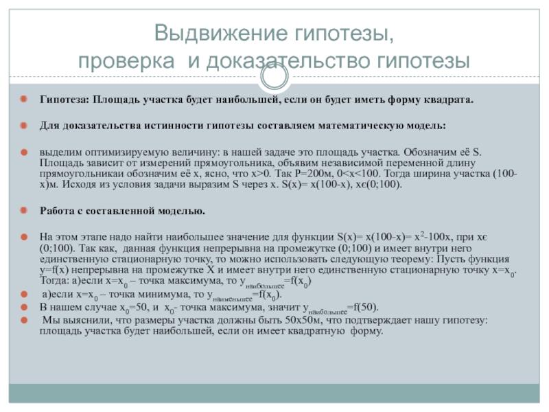 Мы выяснили, что размеры участка должны быть 50х50м, что подтверждает нашу гипотезу: площадь участка будет наибольшей, если он имеет квадратную форму.