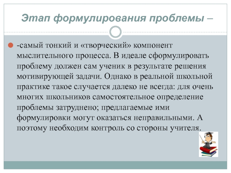 В идеале сформулировать проблему должен сам ученик в результате решения мотивирующей задачи. Однако в реальной школьной практике такое случается далеко не всегда: для очень многих школьников самостоятельное определение проблемы затруднено; предлагаемые ими формулировки могут оказаться неправильными. А поэтому необходим контроль со стороны учителя.