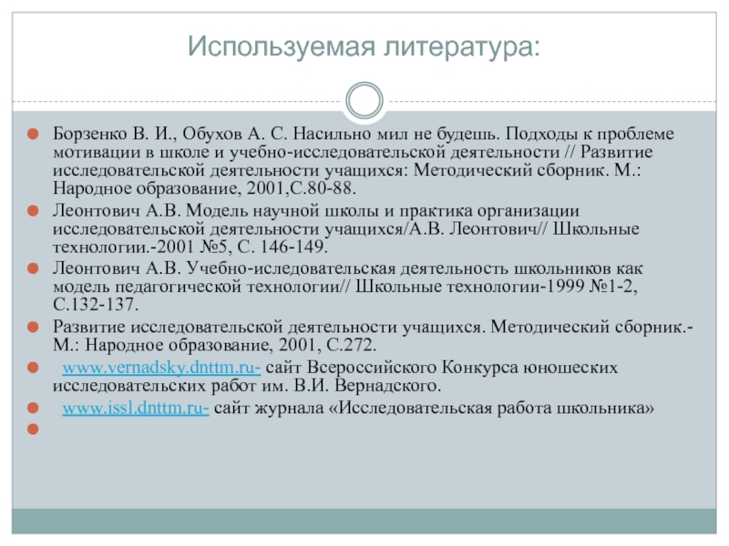 Леонтович А.В. Модель научной школы и практика организации исследовательской деятельности учащихся/А.В. Леонтович// Школьные технологии.-2001 №5, С. 146-149.