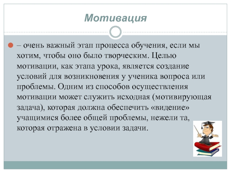 было творческим. Целью мотивации, как этапа урока, является создание условий для возникновения у ученика вопроса или проблемы. Одним из способов осуществления мотивации может служить исходная (мотивирующая задача), которая должна обеспечить «видение» учащимися более общей проблемы, нежели та, которая отражена в условии задачи.