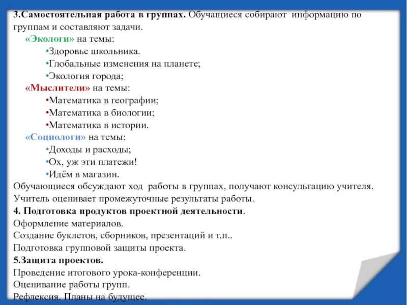 Слайд 103.Самостоятельная работа в группах. Обучащиеся собирают информацию по группам и составляют