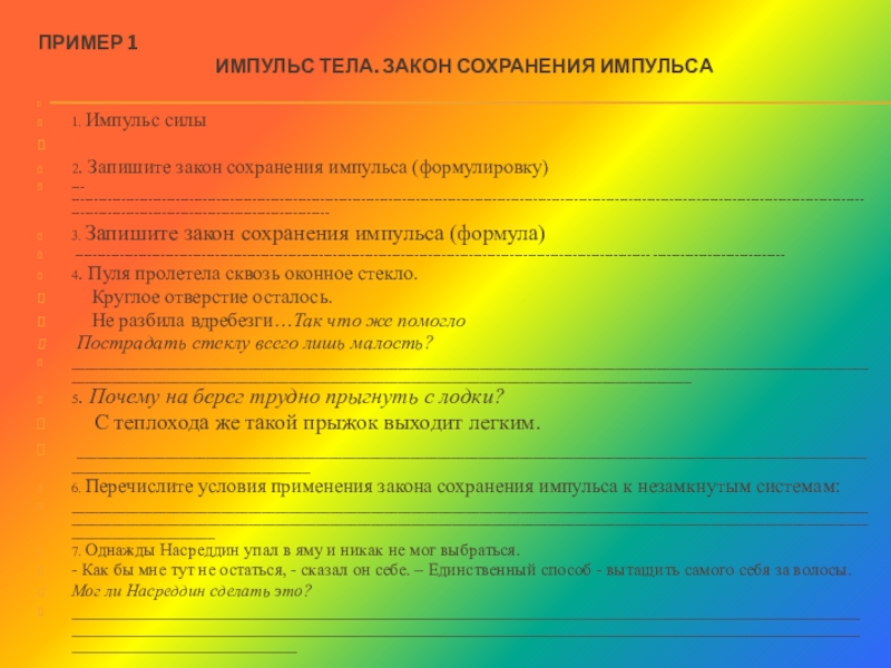 6. Перечислите условия применения закона сохранения импульса к незамкнутым системам:
