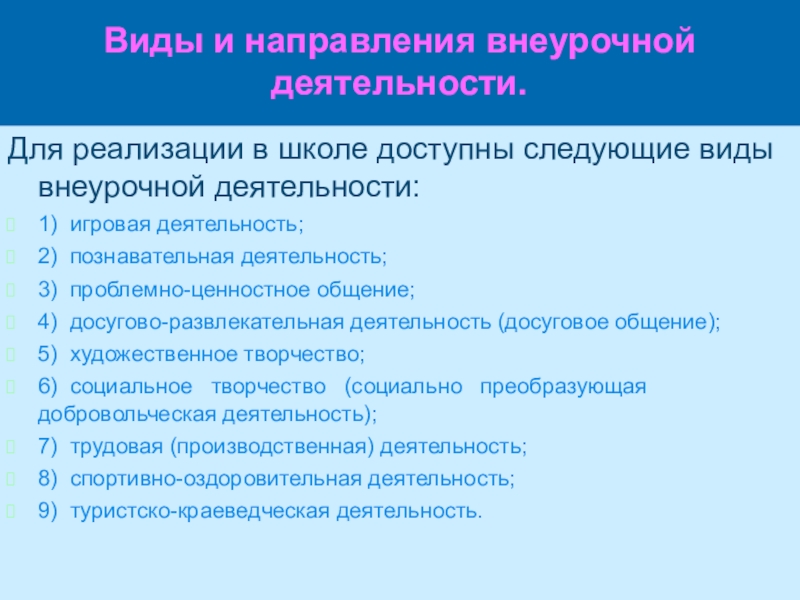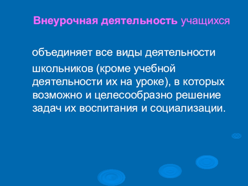 школьников (кроме учебной деятельности их на уроке), в которых возможно и целесообразно решение задач их воспитания и социализации.