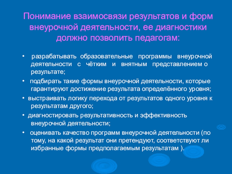 Понимание взаимосвязи результатов и форм внеурочной деятельности, ее диагностики должно позволить