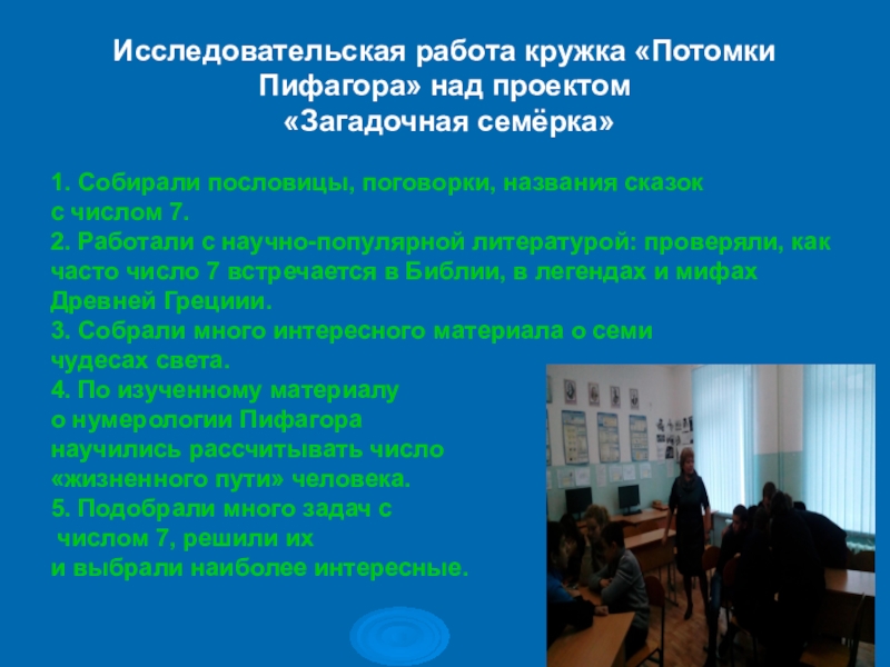Слайд 19Исследовательская работа кружка «Потомки Пифагора» над проектом