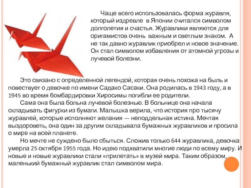 Это связано с определенной легендой, которая очень похожа на быль и повествует о девочке по имени Садако Сасаки. Она родилась в 1943 году, а в 1945 во время бомбардировки Хиросимы погибли ее родители.