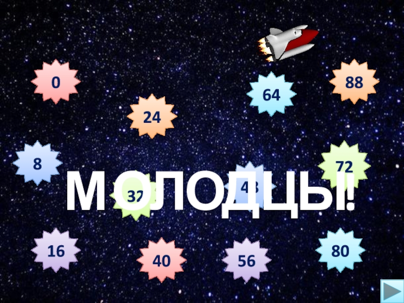 к звезде. Для этого решайте примеры, выбирайте правильный ответ и нажимайте на него. Если ответ выбран правильно, то ракета переместится к нему и появиться новый пример. Помни, если ты ошибёшься, то вернёшься опять к решению первого примера. Попав на слайд «Ошибка», нажимай на ракету, чтобы вернуться в игру.