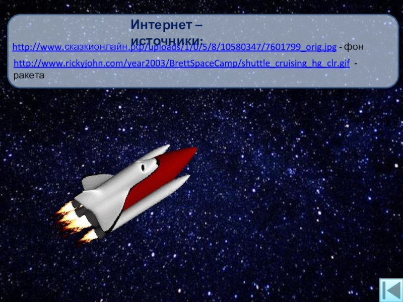 http://www.сказкионлайн.рф/uploads/1/0/5/8/10580347/7601799_orig.jpg - фонhttp://www.rickyjohn.com/year2003/BrettSpaceCamp/shuttle_cruising_hg_clr.gif - ракетаИнтернет – источники: