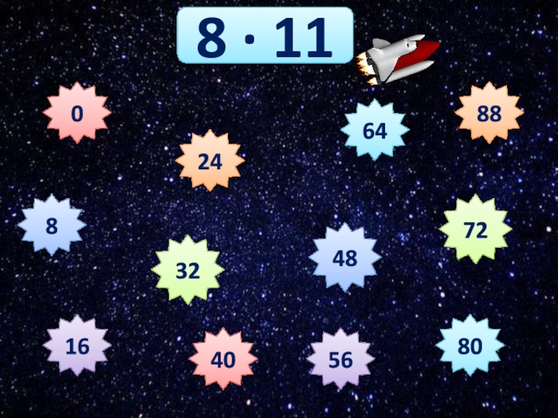 Ребята!Давайте вспомним таблицу умножения на 8, путешествуя на ракете от звезды к звезде. Для этого решайте примеры, выбирайте правильный ответ и нажимайте на него. Если ответ выбран правильно, то ракета переместится к нему и появиться новый