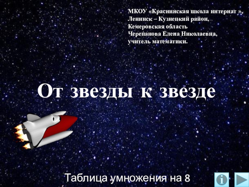 От звезды к звездеТаблица умножения на 8МКОУ «Краснинская школа интернат »,Ленинск – Кузнецкий район,Кемеровская областьЧерепанова Елена Николаевна,учитель