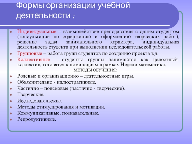 студентом(консультации по содержанию и оформлению творческих работ), решение задач занимательного характера, индивидуальная деятельность студента при выполнении исследовательской работы.