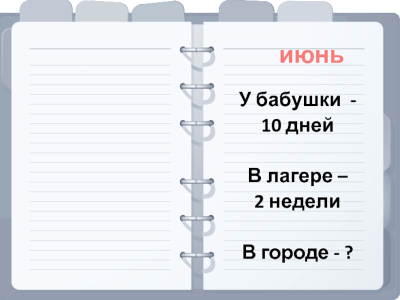 июньУ бабушки - 10 днейВ лагере – 2 неделиВ городе - ?