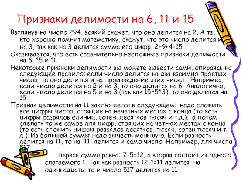 Слайд 15Признаки делимости на 6, 11 и 15