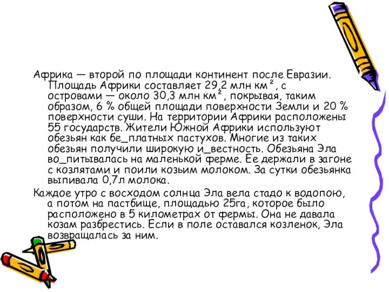 км², с островами — около 30,3 млн км², покрывая, таким образом, 6 % общей площади поверхности Земли и 20 % поверхности суши. На территории Африки расположены 55 государств. Жители Южной Африки используют обезьян как бе_платных пастухов. Многие из таких обезьян получили широкую и_вестность. Обезьяна Эла во_питывалась на маленькой ферме. Ее держали в загоне с козлятами и поили козьим молоком. За сутки обезьянка выпивала 0,7л молока.