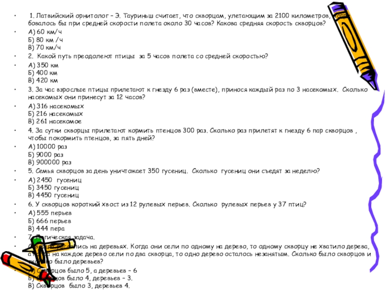 Слайд 3 1. Латвийский орнитолог – Э. Тауриньш считает, что скворцам, улетающим за