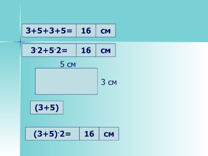 3+5+3+5=3.2+5.2=16см16см(3+5).2=16см5 см3 см(3+5)