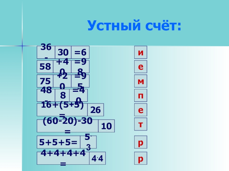 Устный счёт:30и36 -=658+40=98е75+20=95м48-8=40п16+(5+5)=26е(60-20)-30=10т5+5+5=4+4+4+4=5.34.4рр