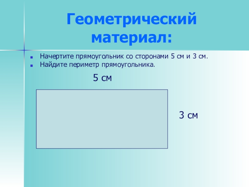 Геометрический материал:Начертите прямоугольник со сторонами 5 см и 3 см.Найдите периметр прямоугольника.5 см3 см