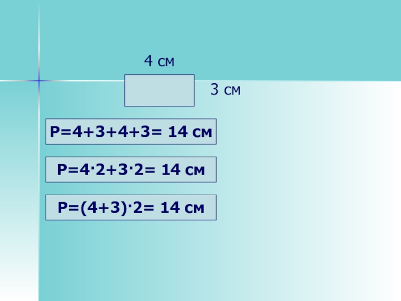 4 см3 смP=4+3+4+3= 14 смP=(4+3)·2= 14 смP=4·2+3·2= 14 см