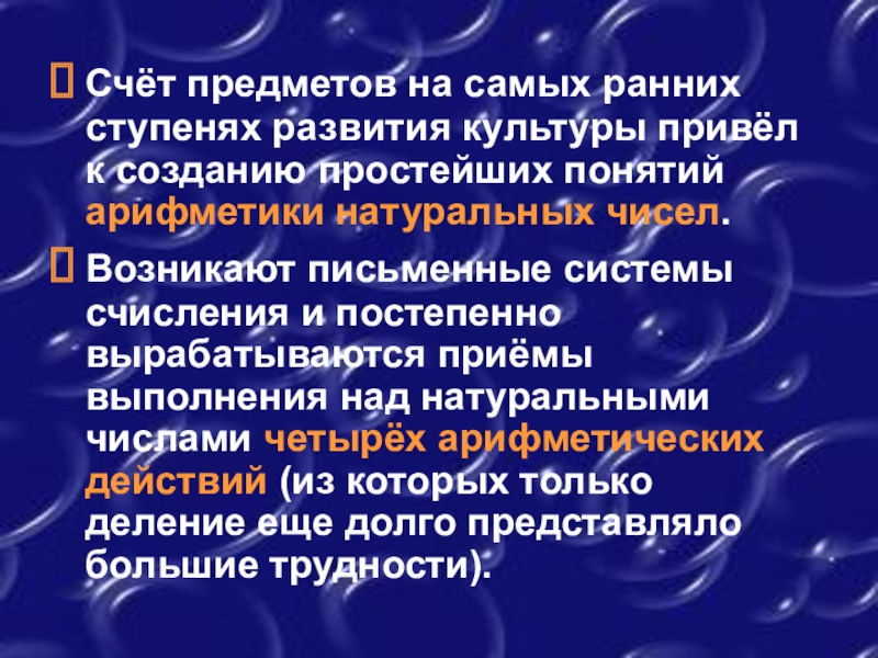 Счёт предметов на самых ранних ступенях развития культуры привёл к созданию простейших понятий арифметики натуральных чисел.Возникают письменные