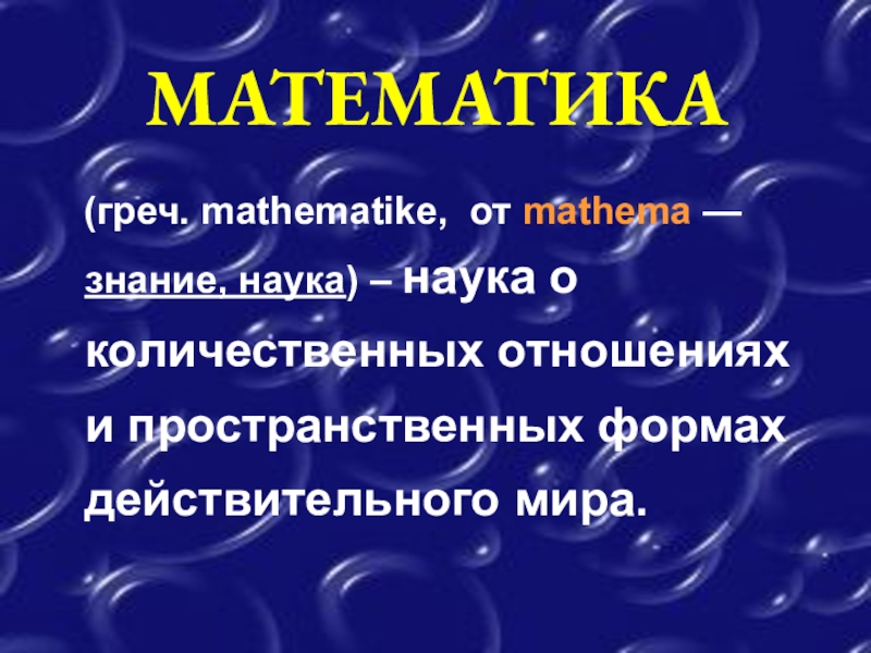 МАТЕМАТИКА  (греч. mathematike, от mathema — знание, наука) – наука о количественных отношениях и пространственных формах