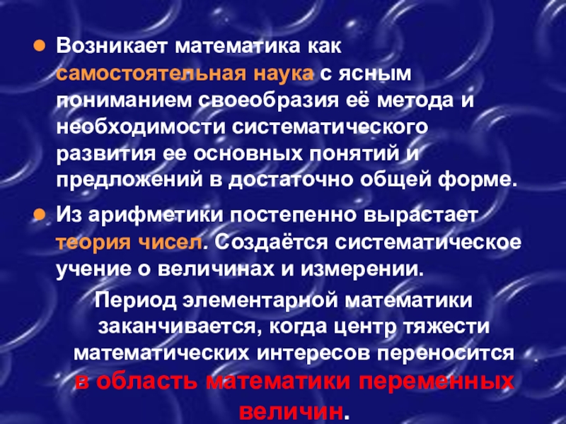 Период элементарной математики заканчивается, когда центр тяжести математических интересов переносится в область математики переменных величин.