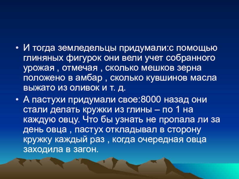 И тогда земледельцы придумали:с помощью глиняных фигурок они вели учет собранного урожая , отмечая , сколько мешков