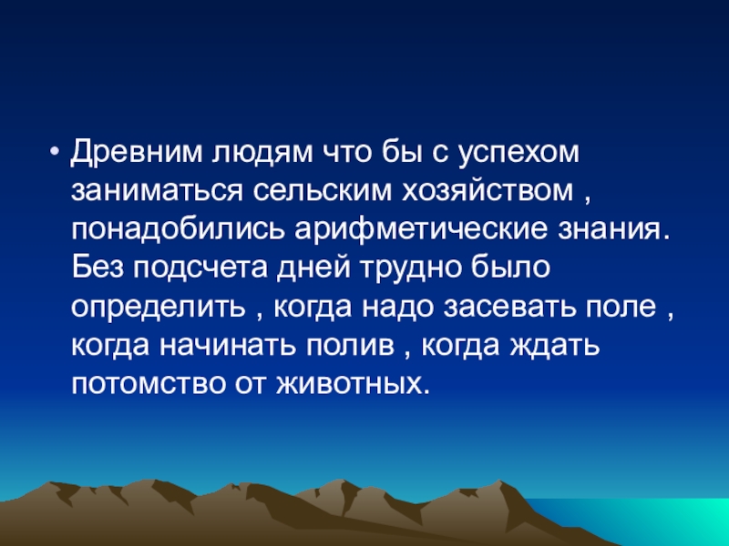 Древним людям что бы с успехом заниматься сельским хозяйством , понадобились арифметические знания. Без подсчета дней трудно
