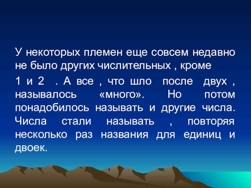 1 и 2 . А все , что шло после двух , называлось «много». Но потом понадобилось называть и другие числа. Числа стали называть , повторяя несколько раз названия для единиц и двоек.