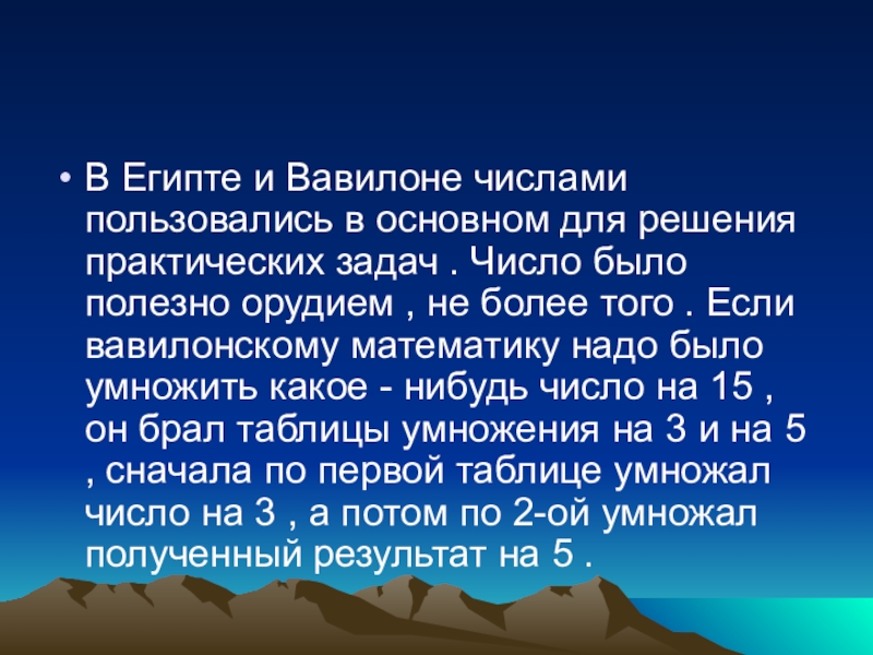 В Египте и Вавилоне числами пользовались в основном для решения практических задач . Число было полезно орудием