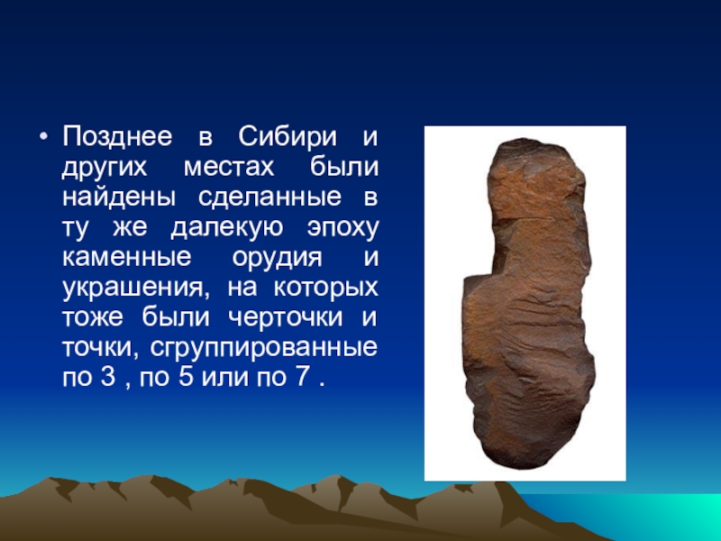 же далекую эпоху каменные орудия и украшения, на которых тоже были черточки и точки, сгруппированные по 3 , по 5 или по 7 .