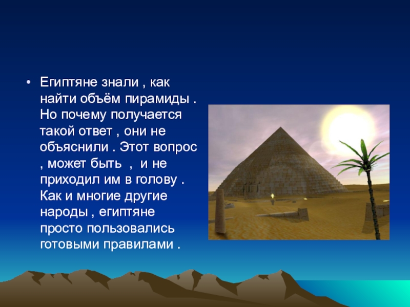 Египтяне знали , как найти объём пирамиды . Но почему получается