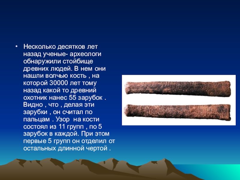 Несколько десятков лет назад ученые- археологи обнаружили стойбище древних людей. В нем они нашли волчью кость , на которой 30000 лет тому назад какой то древний охотник нанес 55 зарубок . Видно , что , делая
