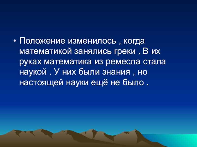 Положение изменилось , когда математикой занялись греки . В их руках математика из ремесла стала наукой .
