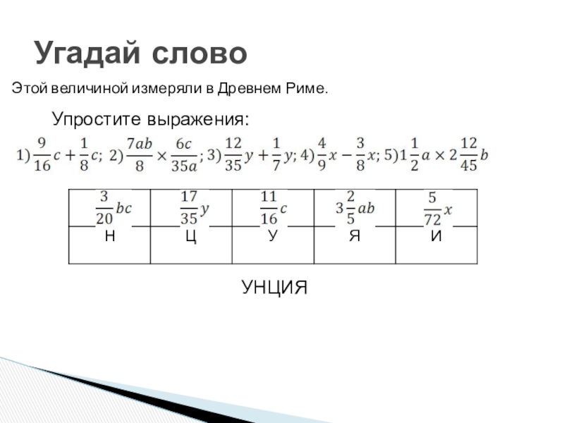 Угадай словоЭтой величиной измеряли в Древнем Риме. Упростите выражения: УНЦИЯ