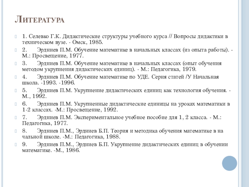 9. Эрдниев П.М., Эрдниев Б.П. Укрупнение дидактических единиц в обучении математике. -М., 1986.