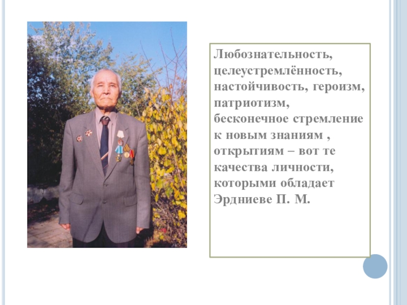Слайд 2Эрдниев Пюрвя Мучкаевич родился 15 октября 1921 года в селе Ики-Бухус