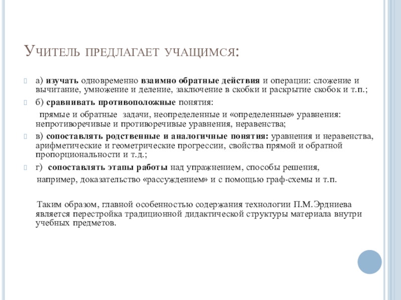 Таким образом, главной особенностью содержания технологии П.М.Эрдниева является перестройка традиционной дидактической структуры материала внутри учебных предметов.