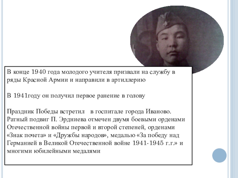 Слайд 6В конце 1940 года молодого учителя призвали на службу в ряды