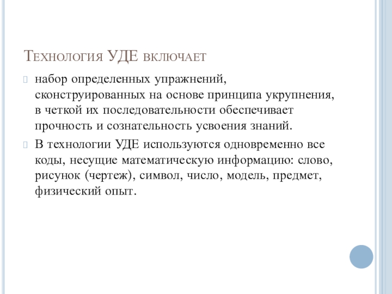 В технологии УДЕ используются одновременно все коды, несущие математическую информацию: слово, рисунок (чертеж), символ, число, модель, предмет, физический опыт.