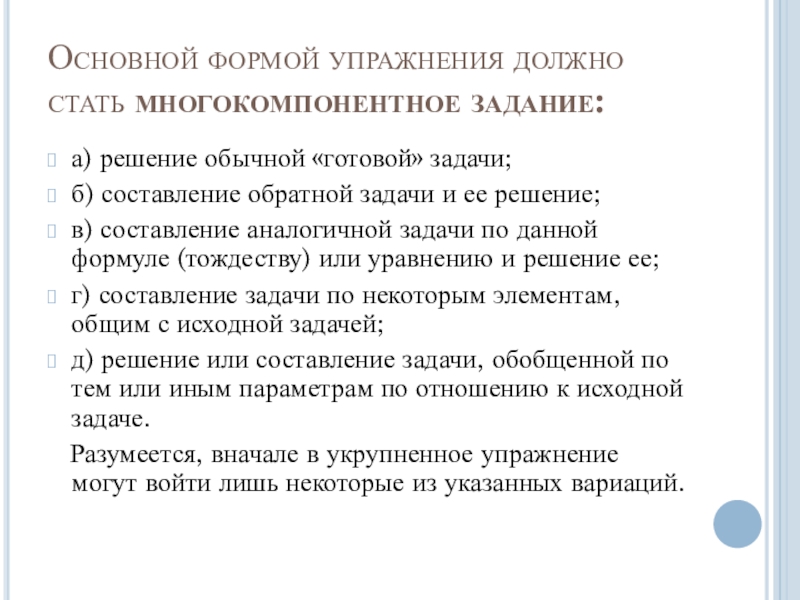 Слайд 16Основной формой упражнения должно стать многокомпонентное задание:
