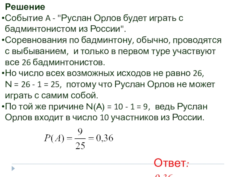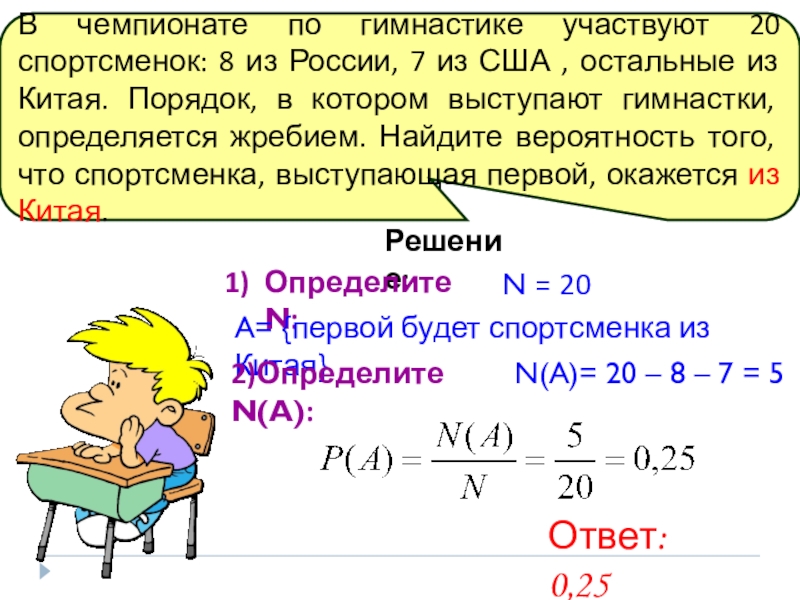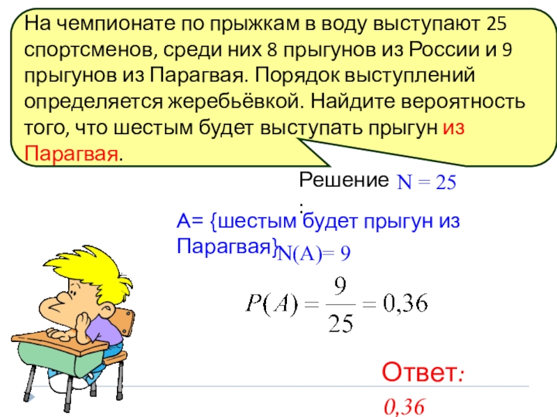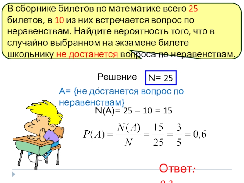 Событие А = {жребий выиграл Петя}, N(A)=1