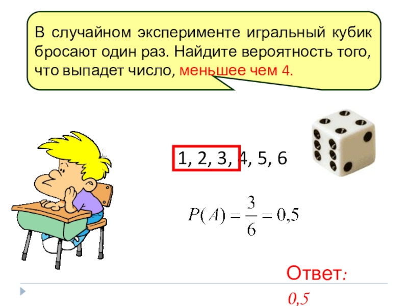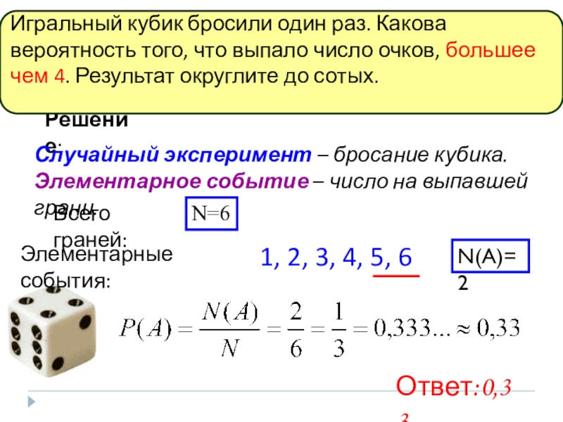 Игральный кубик бросили один раз. Какова вероятность того, что выпало число очков, большее чем 4. Результат округлите до сотых.