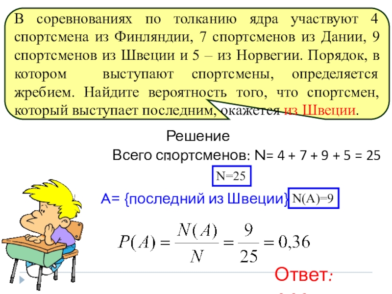 В соревнованиях по толканию ядра участвуют 4 спортсмена из Финляндии, 7 спортсменов из Дании, 9 спортсменов из Швеции и 5 – из Норвегии. Порядок, в котором выступают спортсмены, определяется жребием. Найдите вероятность того, что спортсмен, который выступает последним, окажется из Швеции.