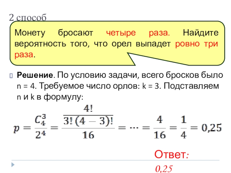 Монету бросают четыре раза. Найдите вероятность того, что орел выпадет ровно три раза.