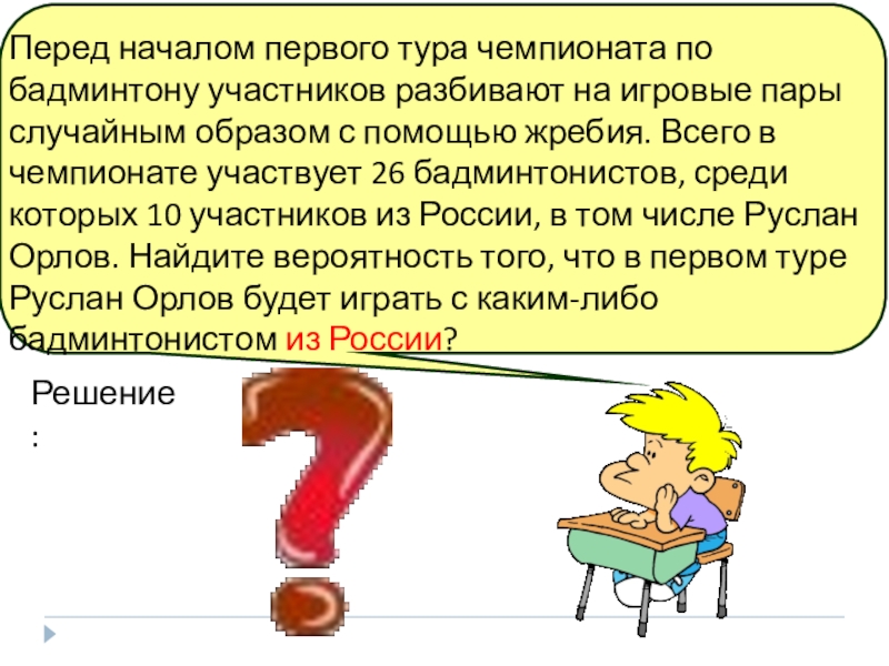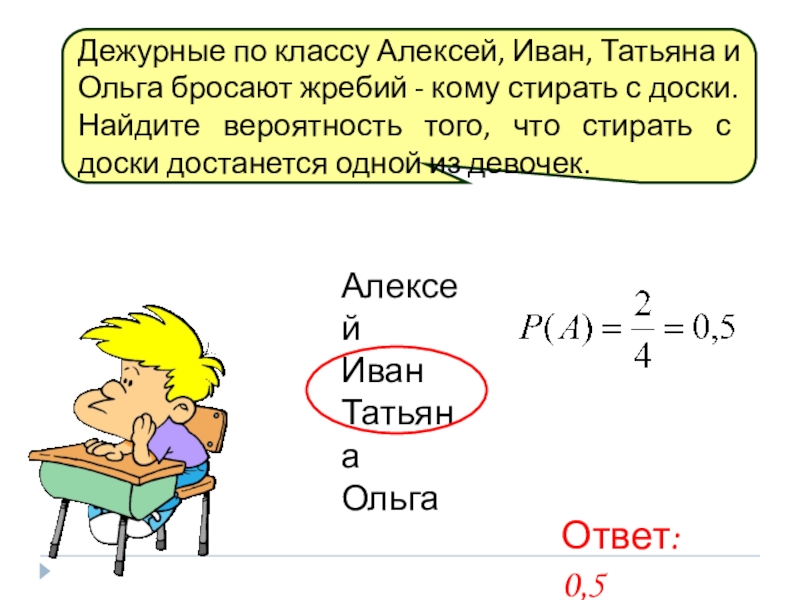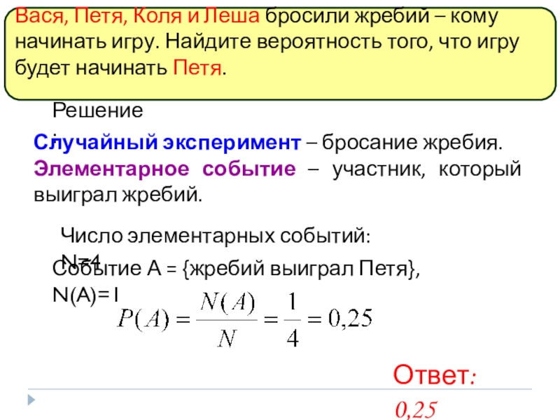 Вася, Петя, Коля и Леша бросили жребий – кому начинать игру. Найдите вероятность того, что игру будет начинать Петя.