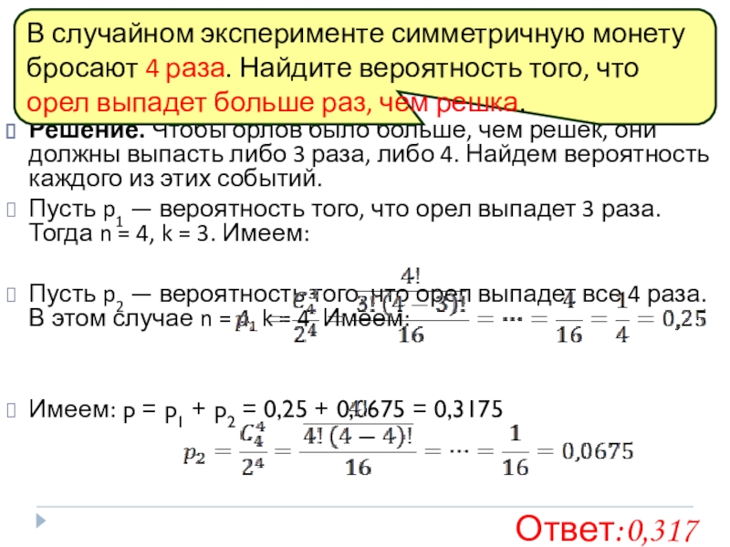 В случайном эксперименте симметричную монету бросают 4 раза. Найдите вероятность того, что орел выпадет больше раз, чем решка.