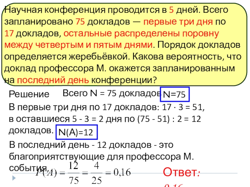 Научная конференция проводится в 5 дней. Всего запланировано 75 докладов — первые три дня по 17 докладов, остальные распределены поровну между четвертым и пятым днями. Порядок докладов определяется жеребьёвкой. Какова вероятность, что доклад профессора М. окажется запланированным на последний день конференции?